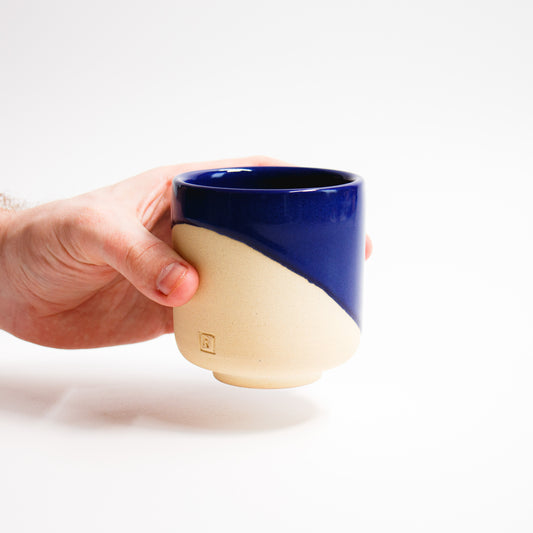 Tasses en gres blanc, émail en biais bleu profond